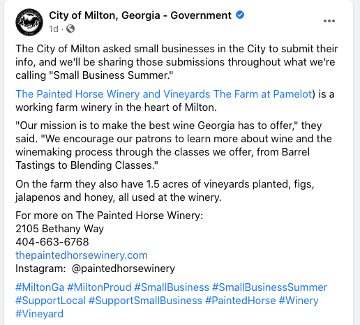 Our local city government steadily provides a rich source of material for this blog. Yesterday was no exception. Yesterday, the City published a Facebook post about the Painted Horse Winery that promotes the farm-winery. Following is a link to the City’s Facebook page. Scroll down to see the Painted Horse post: