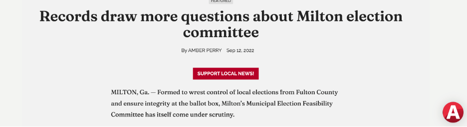 To its great credit, Appen Media has done an excellent job reporting about Milton and other North Fulton cities’ elections initiatives. Following are links to many other (not all) Milton Herald stories about (or related to) Milton’s election initiative. The bolded hyperlinks are the stories I believe are more interesting, including how Milton’s sister cities wisely stepped back from the brink. This list has been updated and reflects articles published through October 20, 2023: