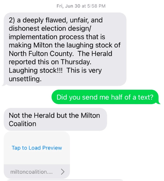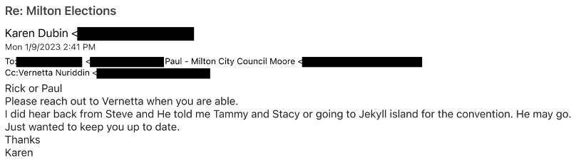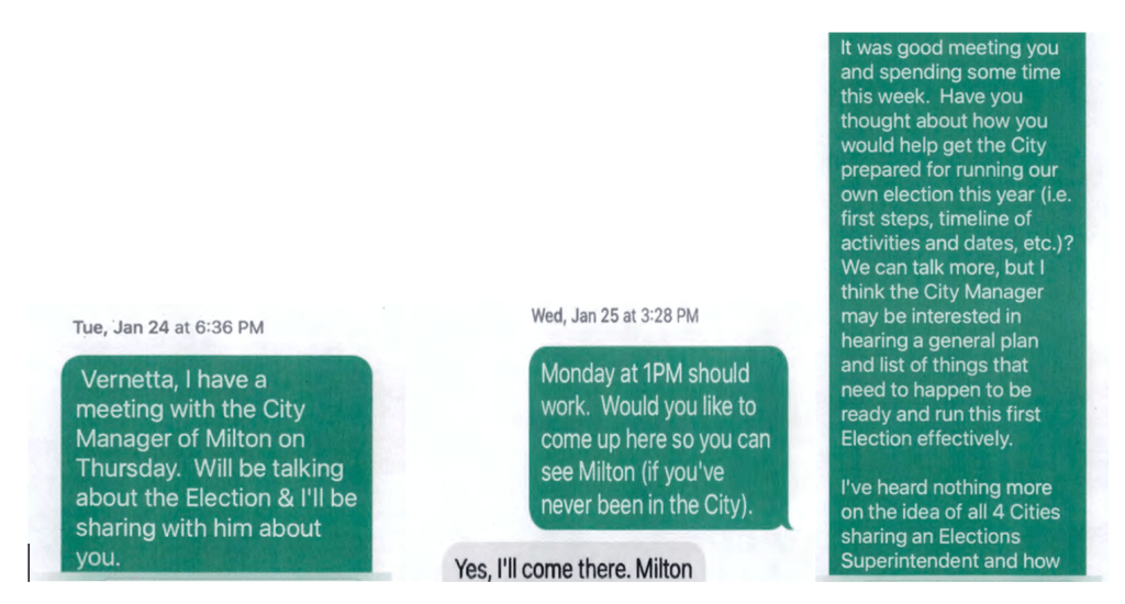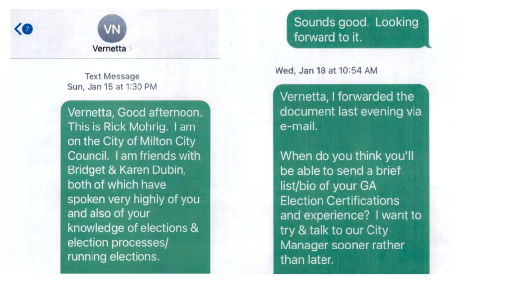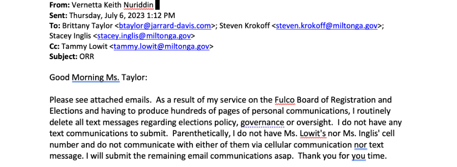 Ms. Nuriddan’s Deletion of Text Communications.After a week of stalling, Milton’s City Attorney finally coughed up the following email from Milton’s election consultant, Vernetta Nuriddan . . . and it is a shocker. I had asked for Ms. Nuriddan’s text messages with city staff and council members Paul Moore and Rick Mohrig. I was especially interested in texts with the two council members. Well, Ms. Nuriddan responded that she “routinely” deletes all “text messages regarding elections policy, governance, or oversight.” My understanding is that Ms. Nuriddan’s contract with the city requires she retain all project communications and that such communications are property of the City. Accordingly, it would seem Ms. Nuriddan is in (material) breach of her contract. I will leave it to readers to decide whether Ms. Nuriddan’s alleged deletion of texts is truthful or not. To date, Ms. Nuriddan has shown refreshing integrity; however, deletion of her text messages certainly now calls her integrity into question.
