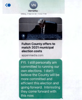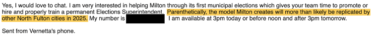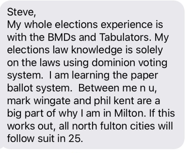 June 21, 2023: In the below email, Nuriddan admits to some major gaps in her election knowledge about paper ballots. More importantly, Nuriddan reveals that her mission in Milton stems from direction she seems to have received from some Fulton County Republican operatives.The Milton elections project is part of a larger partisan initiative to locally run all municipal elections in North Fulton. (Nuriddan alludes to the same in an earlier text message.) This is troubling. Milton should be running its elections because it is the right thing to do, not as part of some broader partisan strategy. I have always felt Milton’s elections project was viewed by its strongest advocates as their ticket to fame and fortune in the Republican party and had little to do with high ideas of improving and strengthening democratic institutions in Milton.