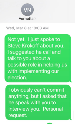 April 27, 2023: Finally, Krokoff and Nuriddan made contact. Clearly, Nuriddan is concerned about Mohrig’s intervention in her potential hiring stating: “I told him (Mohrig) that incumbents cannot participate in the administration of their own elections. No way around that. I promised I would call so I did.” Nuriddan is nothing if not consistent in her concerns about election tampering.