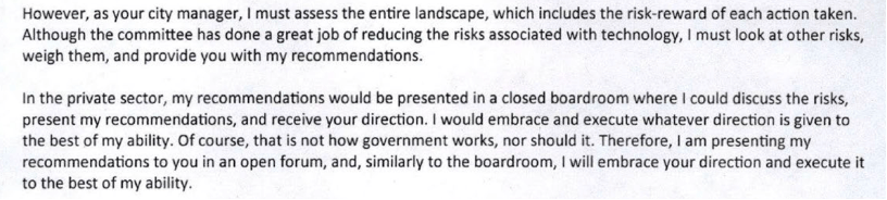 Ms. Nurridan’s criticism does not stop at election disenfranchisement, illegal council interference, and possible legal challenges to election integrity. Ms. Nuriddan also criticizes the city for taking risky shortcuts in its elections planning; limiting her ability to be effective/efficient; and recklessly skimping on legal resources/reviews. I will address these issues in another blog post.