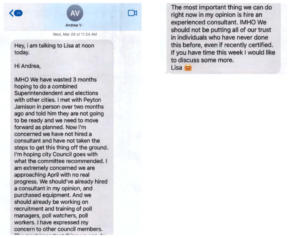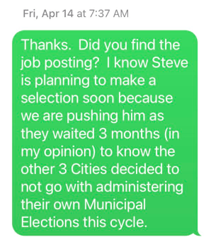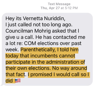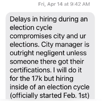 April 14, 2023. Mohrig now appeals to Nuriddan, encouraging her to apply. Nuriddan throws out a price of $17K. It is concerning that matters have proceeded to a point where price is being negotiated and City staff have not been looped in. More interesting is that Nuriddan again warns Mohrig about his actions now that the election cycle has started (February 1). Mohrig never understands (Ms. Nuriddan’s position) that, as an elected official (especially one up for re-election in the Fall), he should not really be involved at all in the election design and planning, including hiring of consultants. At this point, Nuriddan believes the Elections Superintendent (and his staff) should be the sole decision-maker; council must butt out. Mohrig’s (and Moore’s) cluelessness in these matters is stunning.