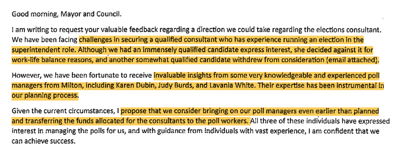 The above screenshot is from the Election Consultant’s July Report. In her monthly report, Milton’s elections consultant, Vernetta Nuriddan, states “I believe that the council erred when two incumbents on the November ballot were empowered to close Election Day polls in areas with high concentrations of people of color.” The two incumbents in question are . . . I’ll give you one guess . . . yes, Rick Mohrig and Paul Moore. (I am attaching the full consultant’s report. See page 4 to read above recommendation.)