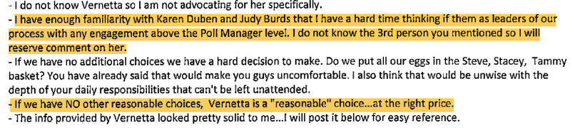 Not to be deterred, Moore rebuts Krokoff. Moore states emphatically “If we have NO other reasonable choices, Vernetta is a ‘reasonable’ choice . . . at the right price.” Game, Set, Match for Moore. Nuriddan is forced on Krokoff. It is incredible to me that Moore and Mohrig feel they should manage Krokoff this closely. I have worked with dozens of boards and never witnessed a board forcing a consultant on their organization’s leader. Never.