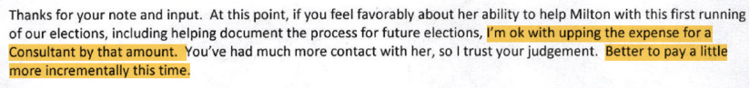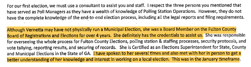 Let me stop here to provide some impressions of Ms. Nuriddan. Ms. Nuriddan is a kind of a folk hero in Republican circles. This is because she is a Democrat who crossed party lines and provided the deciding vote that removed Richard Barron, Fulton County’s election chief. And for this, I applaud Ms. Nuriddan for her intelligence and courage. Furthermore, it is important to note that Ms. Nuriddan seemed at times reluctant to take on the Milton election consulting work. This may be because Ms. Nuriddan had not previously consulted and she did not have actual experience running an election and she has a day job as an Education Specialist in Atlanta’s charter schools. However, my sense is that Ms. Nuriddan’s reticence had at least partly to do with poor practices being applied by the City in its election work . . . undue influence, lack of rigor, secretiveness, etc.I must admit that while I found (like staff) Ms. Nuriddan’s qualifications to be thin, I admire Nuriddan’s consistent integrity and her willingness to call out and warn against less-than-ethical actions she was witnessing in Milton. You further get a sense that Rick Mohrig used a carrot-and-stick approach with Ms. Nurridan. The “stick” was Mohrig heavily pressuring both City Manager Krokoff and Nuriddan into a kind of political forced marriage. The carrot was Ms. Nuriddan’s compensation increased from $17K to $25K. (If Mr. Mohrig was helping Ms. Nuriddan negotiate with the City on price or scope, that would seem a serious ethics violation.)