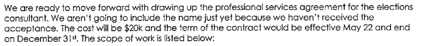 February 28, 2023. In late February, the City determines the scope of election consulting work. The cost will nearly double from a budgeted $13,000 to $25,000. (Both numbers are ridiculously low resulting in elimination of the most capable firms and consultants.)