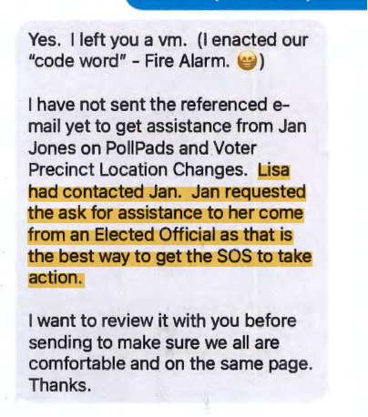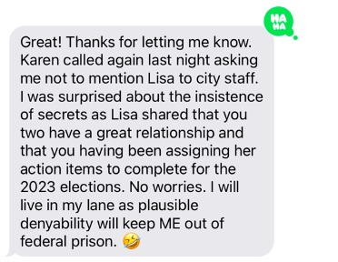 May 9, 2023: Lisa Cauley again pops us in texts from Mohrig to Krokoff. It seems Mohrig has tasked Cauley to work with State Assembly Representative Jan Jones, but Jones smartly waves off Cauley and demands an elected official request her assistance. This is first email indicating that Cauley is being assigned official tasks by the City government, but in what (if any) official capacity is unclear. This use of such off-the-books supernumeries, particularly political partisans, (especially for elections design/planning) should be troubling to citizens.