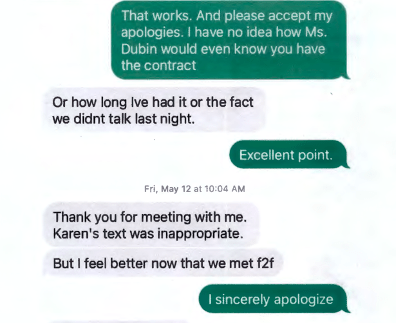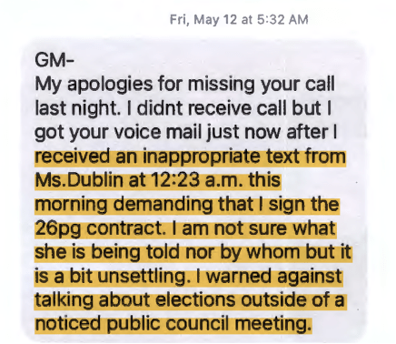May 12, 2023. Karen Dubin, who introduced Mohrig to Nuriddan, now re-enters the picture when contract negotiations are underway with Nuriddan, who complains about Ms. Dubin’s “inappropriate” late-night text message “demanding that I sign the 26 pg contract.” Nuriddan is rightfully annoyed and rightfully upset that someone (Mohrig?) is sharing information with Dubin . . . a violation of confidentiality and likely of Milton’s purchasing rules and possibly undermining Milton’s negotiating position. Nuriddin again expresses concern about sloppy and unethical processes at Milton stating “I warned against talking about elections outside public forums.” She correctly wants to maintain discipline around citizen participation; integrity demands participation occur within the boundaries of the public process. Clearly Nuriddan is wary of the potential influence of partisans (and council members) outside of the established process. Following is Nurridan’s dialogue with Krokoff, with Dubin’s text (the black text box) attached: