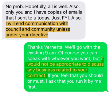 Do you get a sense that both Ms. Nuriddan and the City were forced into a contract by Mr. Mohrig and Moore? Why? Did the Gang of Four believe they could continue to exercise control from the shadows? Clearly, this issue comes to the fore when Krokoff directs Nurridan to cease all communications with council and the community. Ms. Nurridan had long been warning about running a loose and leaky process, even before she was hired. She also expressed concern about undue influence of council and individual council members in election design.