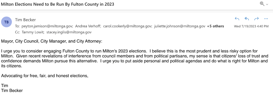 Second,write to the mayor, city council, the city manager, and city attorney and express your dissatisfaction with Milton’s election initiative and urge them to engage Fulton County to run Milton’s 2023 elections. Following are their email addresses: