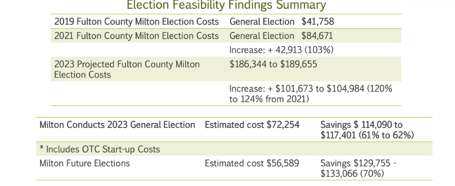 It is unclear what Cauley and Mohrig assumed would be FuCo’s cost to run Milton’s 2023 municipal election. However, in February, FuCo capped elections costs at $5.72M for Fulton County. My rough calculations (using 2 different methods) indicate the FuCo would charge Milton no more than $225,000 to $235,000. (Note: There is a true-up based on actual votes per locality, so the final costs are ultimately unknown and unknowable at this time. And there are a few other unknowns. However, FuCo costs can be ball-parked based on reasonable assumptions.) Comparing these estimated FuCo maximum costs with Milton’s costs means that Cauley and Mohrig’s estimated cost savings of $200,000 to $250,000 are an impossibility for 2023. Pure fantasy! And that is why I submitted the ORR . . . Cauley and Mohrig need to put up or shut up . . . admit that they have no support for their projections or else cough up substantiation of their claims (if they are keeping their own set of books on municipal elections).