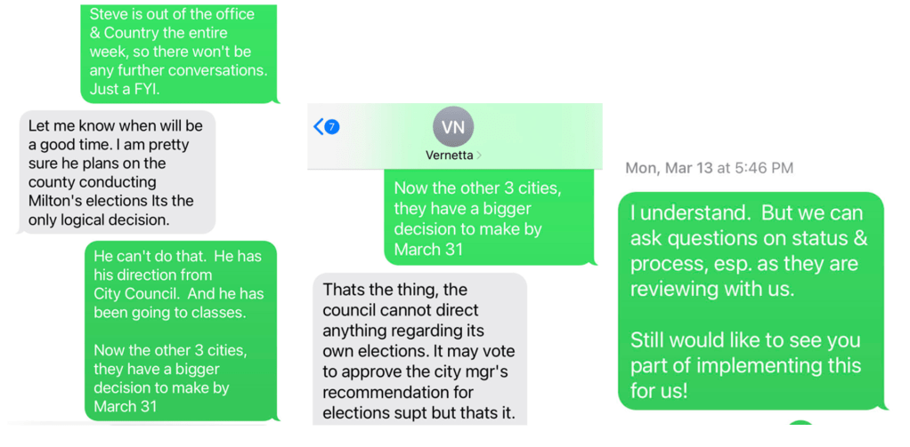 March 13, 2023: Nuriddin and Mohrig exchange a shocking set of texts. There is a lot here that is worth considering. First, Nuriddan opines that she believes Krokoff is planning “on the county conducting Milton’s elections” and states “It’s the only logical decision.” Nuriddin is asserting this because Krokoff is the Superintendent and as such, she believes it is his (and only his) decision to make. Second and more importantly, it is revealing that the consultant (Ms Nuriddan) that Mohrig wants to hire and succeeds in getting hired believes Milton should NOT run its elections. Mohrig argues that Krokoff cannot ignore council’s direction. However, Nurridan does not back down and asserts that “council cannot direct anything regarding its own election. It may vote to approve the city mgr’s recommendation for election supt. but that’s it.”This is a position that Nuriddan consistently states and defends throughout her communications in this blog. Essentially, Nuriddan is warning Mohrig that he and council need to be careful about meddling in elections and dictating to the Elections Superintendent, which is Krokoff. I assume Nuriddan knows what she is talking about; otherwise the City should not have hired her. This issue of the supremacy of the Elections Superintendent is a critical one. Mohrig finally accedes her point, but states he still wants her to help the city with implementation. He just doesn’t get it.