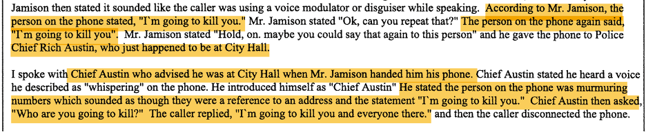 Shortly after receiving the first two texts, Mayor Jamison received a phone call threatening to kill him. Coincidentally, Police Chief Austin was in the room. The mayor passed the phone to Chief Austin and the caller again repeated the death threat to Chief Austin. Following is the excerpt from the police report about the phone call. (I am including the full redacted police report at the end of this blog post.)