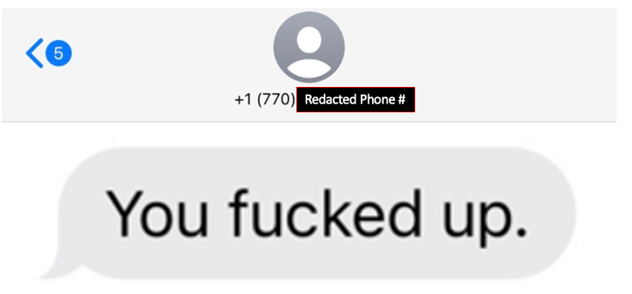 Fast forward (about a half hour) to the start of the city council meeting, with Mayor Jamison presiding. A third text stating “You fucked up” was sent during the council meeting . . . this was the texter’s answer (I assume) to the mayor proceeding with chairing the Milton City Council meeting. I would infer that the caller was watching council’s live-streamed meeting (or was attending in person). The text was sent at 6:01 pm . . . just 1 minute after the council meeting commenced. See text below: