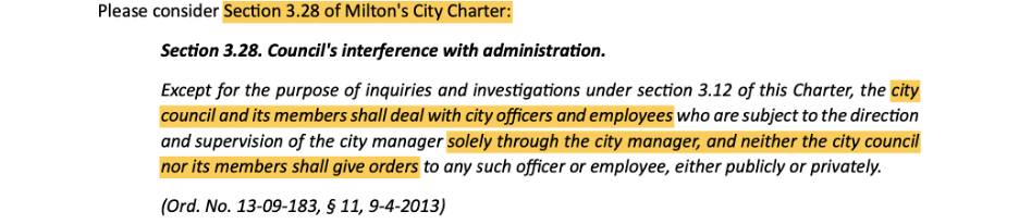The above screen shot is from Milton’s city charter (the municipal equivalent of the US Constitution) and clearly states that city council members should deal with city employees solely through the city manager. This is Good Governance 101. However, certain council members feel that they are above the law . . . and often that they are the law. Rick Mohrig is one such rogue council member who routinely directs staff.