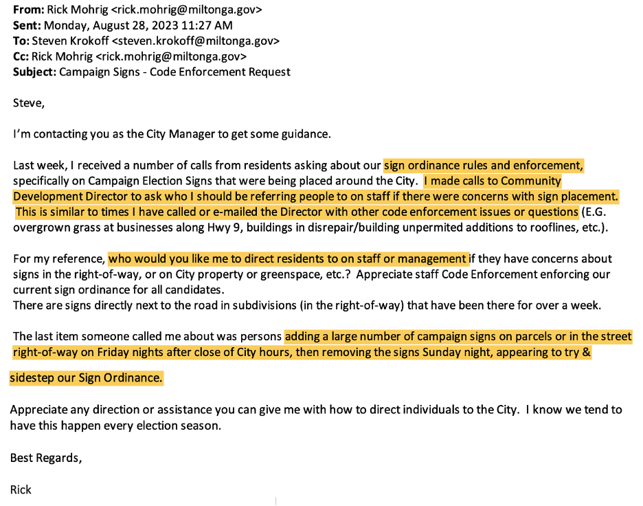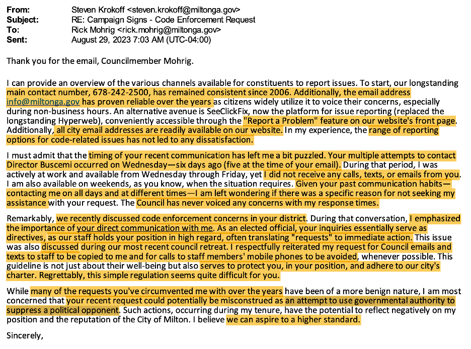 Recently, Mohrig threw a temper tantrum over alleged irregularities in his election opponent’s placement of campaign signs . . . blowing up the Community Development Director’s phone. Following is an email from Mohrig to the City Manager and the City Manager’s email response.City Manager Krokoff does not mince words and blasts Mohrig with his response. Mr. Krokoff is usually quite diplomatic in his interactions with council (as collectively, council is his boss), but clearly in this situation, Krokoff had more than enough of Mr. Mohrig’s interference with staff. Krokoff states that this episode is just one of many meddling incidents over the yearsinvolving Mohrig. However, in this case, Mohrig’s meddling could be interpreted as, Krokoff states . . . “an attempt to use governmental authority to suppress a political opponent.” In addition to his blunt email, Krokoff sent an equally blunt memo to staff reiterating, in very specific terms, prohibitions against council members interfering in daily city operations. The memo is attached with the more important parts highlighted in yellow.