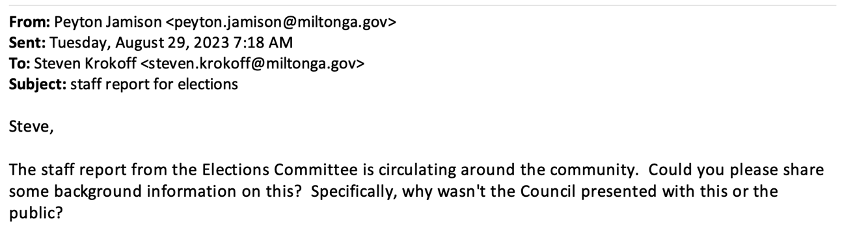 Working from the outside, using Open Records Requests (ORR), my visibility into Milton government is sometimes limited. However, due to my long and deep experience with local government since 2015, I am usually able to connect enough dots to provide readers a good sense of what is happening behind the city government curtain. However, I assume . . . and readers should also assume . . . that the real situation is usually worse (not better) than can be discerned from the outside, not unlike the tip of the proverbial iceberg. I assumed this was the case with Milton’s election initiative . . . that it was even more corrupted than it seemed . . . most of the iceberg was below the surface and unseen. And with each ORR I submit, this is confirmed . . . Milton’s elections story becomes ever more unseemly . . . more of the iceberg is revealed. Thankfully, we are finally getting a rare insider’s view of Milton’s elections project . . . and it is coming from the top executive in Milton City government: City Manager Krokoff. It is not only confirmatory but is actually worse than even I believed. I suppose Krokoff has become fed up with the “revisionist history” (his words), especially relating to the mistreatment of his staff. Read on . . .