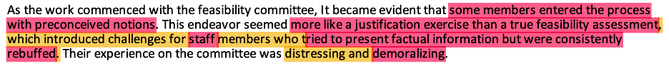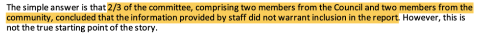 Krokoff confirms that the partisan staff members—two council members and 2 hyper-partisan activists—concluded that “the information provided by staff did not warrant inclusion.” Translation: Certain critical information was withheldfrom the public and council—for example, an excellent 7-point risk analysis and staff costs in the business case. Non-inclusion of such essential information (that did not support a partisan narrative) provides proof of the Krokoff’s assertion of bias in the four non-staff committee members. As revealed later in his email, non-staff members’ rejection of the staff draft was indicative of a long pattern of criticism, marginalization, and disrespect for the city staff committee members.