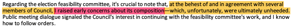 As Krokoff states, Mohrig has a long and dismal record of improper interactions with staff—some quite disrespectful and dismissive. Readers might recall that I recently wrote about how Council Member Mohrig–and the other partisan members of the Election Feasibility Committee (EFC)–shunted aside city staff EFC members. The four partisan members deleted important details that were contained in an EFC draft report authored by Deputy City Manager Inglis. This included an essential 1) discussion of election risks and 2) staff costs in the elections business case. Following is a link to my blog post: