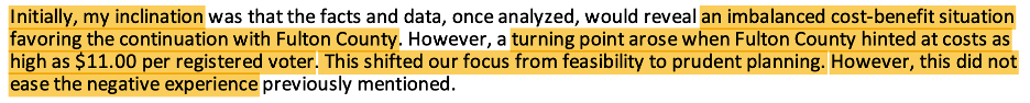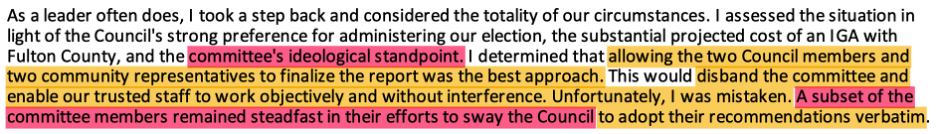 Krokoff asserts there was “a revisionist history that has pervaded this process.” He states that one merely needs to review the council meeting recordings and public comments to draw this conclusion. I have watched all the council meeting videos and agree with Krokoff’s assessment. Pervaded is a strong term that I also agree with. Both Rick Mohrig and Paul Moore are still pitching a narrative that just doesn’t pass the BS test. For example, at the last council meeting, Moore again falsely asserted that the elections initiative was purely about cost savings, when the evidence clearly shows the chief drivers were election integrity (and more specifically avenging the alleged stolen 2020 presidential election) and Fulton County’s competence (or lack thereof) in administering elections.