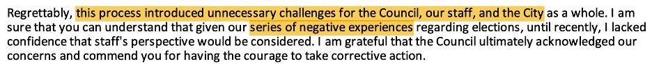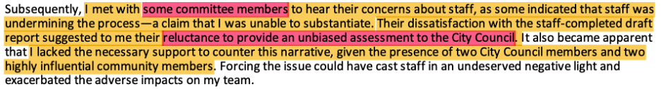 Despite the shift to “prudent planning,” it did not “ease the negative experience” of a biased committee that criticized, disrespected and marginalized staff. However, given “the presence of two City Council members and two highly influential community members,” Krokoff determined he “lacked the necessary support to counter this narrative.” Citizens, this is exactly WHY the City Charter prohibits council member appointment to committees.