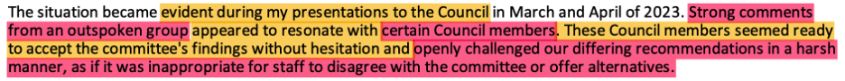 Excessive Partisan Activist Influence and Overly Compliant Council. “Strong comments from an outspoken group appeared to resonate with certain Council members” such that they “seemed ready to accept the committee’s findings without hesitation.”