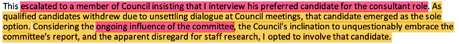 Constant Post-EFC Interference. After the EFC was disbanded, “A subset of the committee members remained steadfast in their efforts to sway council” such that they “openly challenged our differing recommendations in a harsh manner, as if it was inappropriate to disagree . . . or offer alternatives.” Refer to my blog post from July 17th for more details about continued interference from EFC members once the EFC had disbanded: Election Interference (Part 2): Backroom Tampering in Hiring and Work of Milton’s Election Consultant