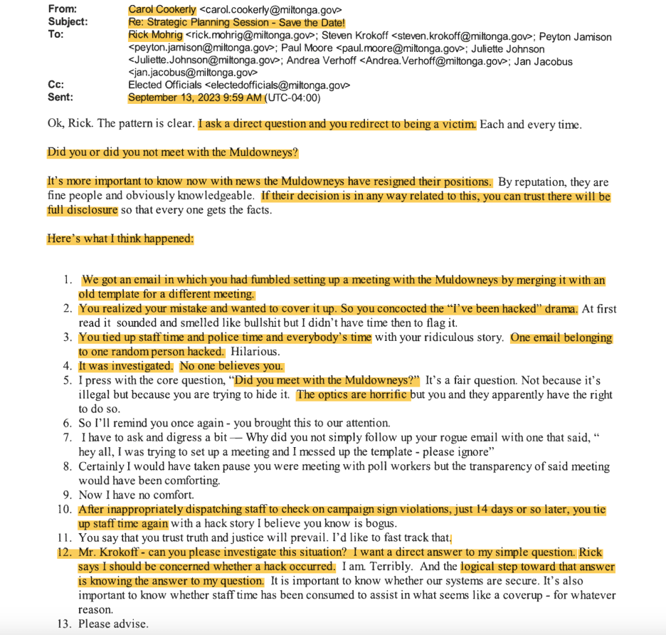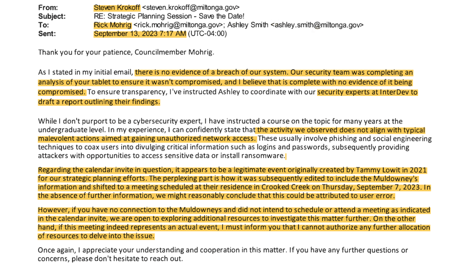 Krokoff said “the Milton IT department and a third-party network security provider found that neither Mohrig’s email address nor the city’s computer system were hacked . . . councilman’s efforts to hide it (the meeting) raises questions and concerns.”