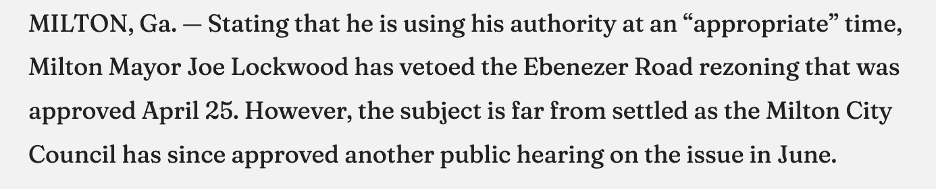The only reason that the issue returned to council was because Joe Lockwood courageously vetoed the ordinance (ostensibly) on procedural grounds (but in reality to give citizens another chance to fight the rezoning). (This was Lockwood’s second and last veto while he was mayor for 15 years.) Following is a screenshot from the Milton Herald about the vetoand the approval of another rezoning hearing scheduled for June 20, 2016.