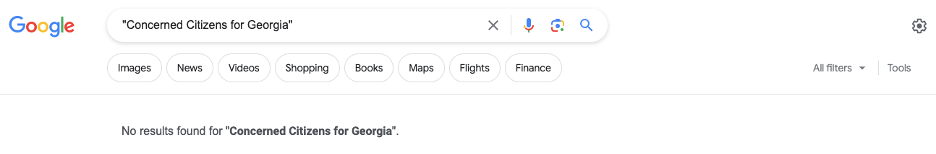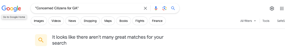 My suspicions aroused, I began to research the Concerned Citizens for GA (CCG), which asserts it is “group of grassroots citizens . . . not affiliated with any political party.” I googled Concerned Citizens for Georgia (both spelling out “Georgia” and using “GA” as used in the email invitation) and I found literally nothing . . . ZERO search results.
