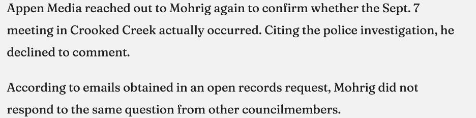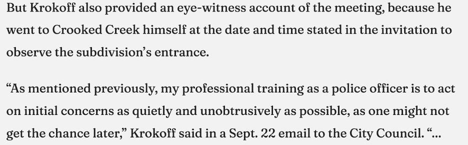 Here is where events get interesting. It has been verified by the City Manager thatMohrig DID ATTEND the meetingthat was the subject of the email invitation. In Perry’s article, City Manager Krokoff revealed that he surveilled Crooked Creek where the meeting occurred and witnessed the meeting. In an email to City Council (on September 22nd), Krokoff stated that he was an eye-witness to the meeting. See following passage from Milton Herald: