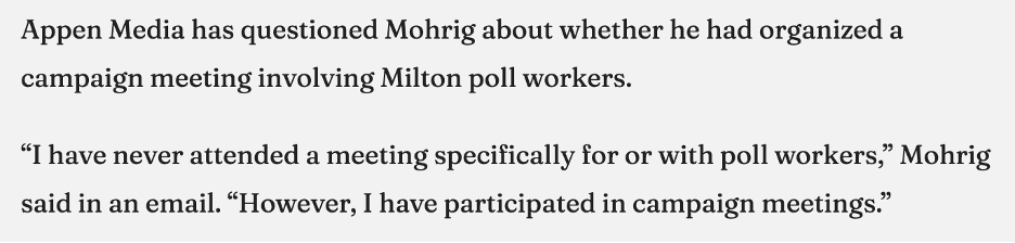 Mohrig clearly and transparently dodges the question. Even though Perry asks whether he organized a meeting “involving Milton poll workers,” Mohrig deflects the question with the word “specifically,” thereby responding to a question that was not asked . . . a typical politician’s trick answer. This is the cat-and-mouse game that has so infuriated Council Member Cookerly. In his deflection, Mohrig implies others were present at the meeting, raising more questions . . . who were these other people? Now that there is an active police investigation . . . it seems prudent to interview these people. I suspect this could get uncomfortable for certain local partisan activists and politicians that like to operate in secrecy.