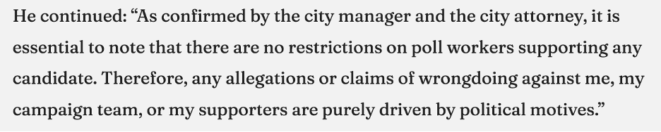 “The councilman did not respond to questions from Councilwoman Carol Cookerly . . . asking if he in fact met with the poll workers.”