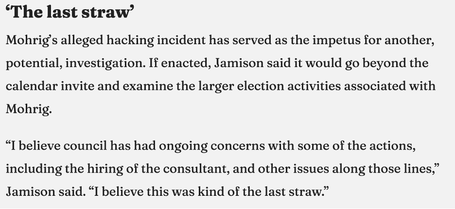 “The police and city council are looking into possible false allegations by Mohrig that his email was hacked.”