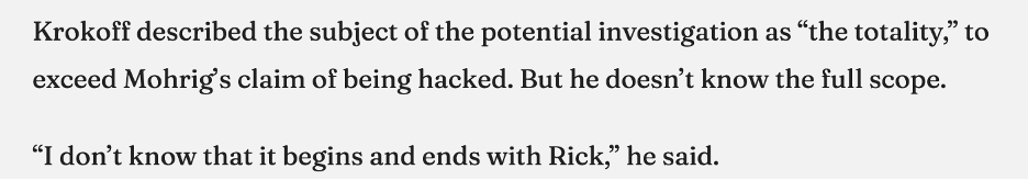 Krokoff went even further (than the mayor) stating that an investigation would address “the totality,” and further stating “I don’t think it begins and ends with Rick.” This is encouraging. It seems Krokoff is advocating a broad-based investigation of elections design, planning, and preparations over the past two years . . . and that such an investigation might include more bad actors (than just Mohrig). Readers might recall that Krokoff pulled no punches in a recent email (to the mayor) about Milton’s dysfunctional and dishonest elections project. He was particularly dismayed by disrespectful treatment of his staff by Council Members Moore and Mohrig and the Election Feasibility Committee’s (EFC) appointed partisan members. (Following is a link to my article about Krokoff’s highly critical assessment of Milton’s elections project: Elections Interference (Part 5): City Manager’s Insider Perspective Reveals a More Deeply Flawed, Biased, and Dishonest Process Than Milton Coalition Investigation Uncovered)