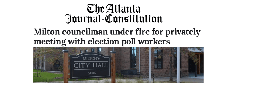 Once again, the City of Milton is in the news . . . and once again, the news is embarrassing . . . and once again Council Member Rick Mohrig is at the center of a swirling controversy. Last week, I and the Milton Herald reported on the scandal involving Rick Mohrig’s meeting with poll workers and his (so far unsubstantiated) allegations of computer hacking. (Links to my and the Herald’s stories are provided at the end of this post.) Today, the Atlanta Journal-Constitution is the latest media outlet to expose Mohrig’s lack of integrity. Following is a link to the AJC’s story published this morning. A pdf of the article is provided at the end of this blog post.