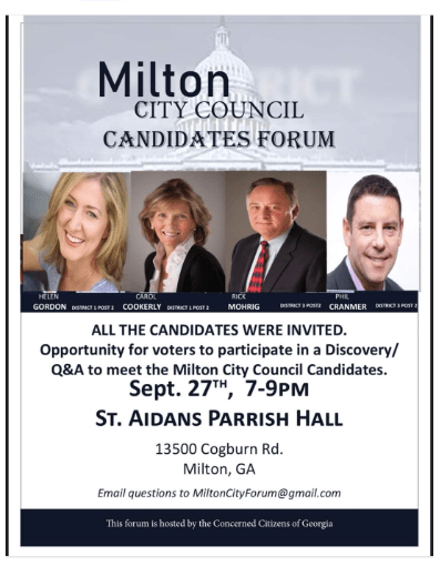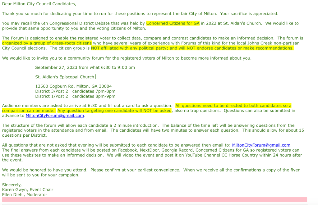I have been involved in Milton politics and government since 2015, so I have developed a sensitive nose for BS. I can sniff out a political set-up or dirty trick from a mile away. So I had myself a good chuckle when I was recently forwarded an email “invitation” (all quotes intentional) for a candidate “forum” sponsored by “Concerned Citizens for GA” that was sent to all four candidates in Milton’s upcoming city council races. I laughed because this political ploy was so clumsy and amateurish. Just what you would expect from the not-so-clever tricksters organizing this forum. (The invitation is provided at the bottom of this post.)