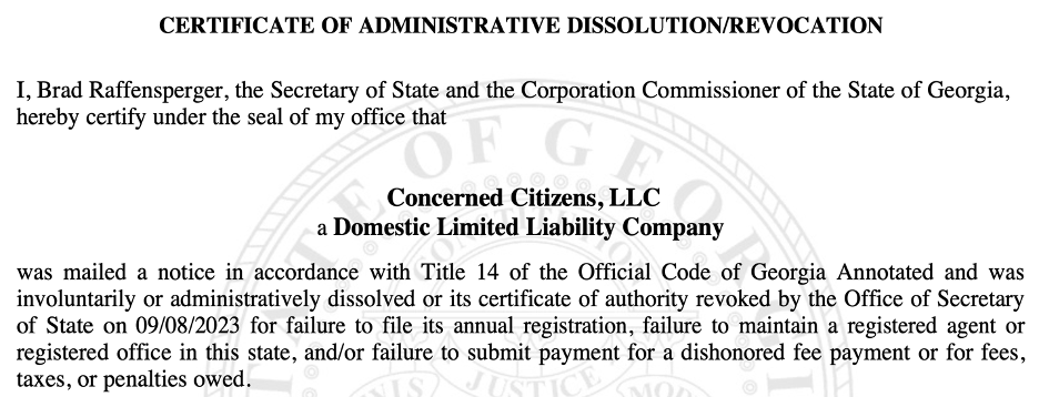 Unfortunately, the slight name change did not work either. There is . . . or more accurately was . . . a Concerned Citizens of Georgia. However, Concerned Citizens of Georgia was administratively dissolved by Georgia’s Secretary of State on September 9th. You really can’t make this stuff up!