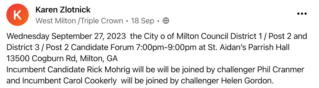Attached at the bottom of this post is a pdf file with excerpts (from my blog post) about Dubin’s interference in the hiring and engagement of Milton’s elections consultant. You can access the blog post by clicking on this link: Election Interference (Part 2): Backroom Tampering in Hiring and Work of Milton’s Election Consultant. BTW, Ms. Dubin is also Recording Secretary of Fulton County Republican Women; Lisa Cauley is the president. So Dubin is not non-partisan as she claims. Similarly, an internet search of the moderator also indicates that she is a partisan activist leader.