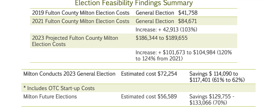 Yesterday, the Milton Herald’s Amber Perry published an excellent analysis of Milton’s elections costs that now shows that Milton will pay more . . . much more . . . to self-run its elections than if it had paid Fulton County to run its elections.  Right now, the cost exceeds FuCo’s by 29%, or $63,000+.  Costs will rise a lot more.  Why?  First, some costs are not (yet) included.  Second, the City continues to encounter issues not anticipated (or not fully appreciated) by the Elections Feasibility Committee (EFC).  Following is a link to the Milton Herald article: