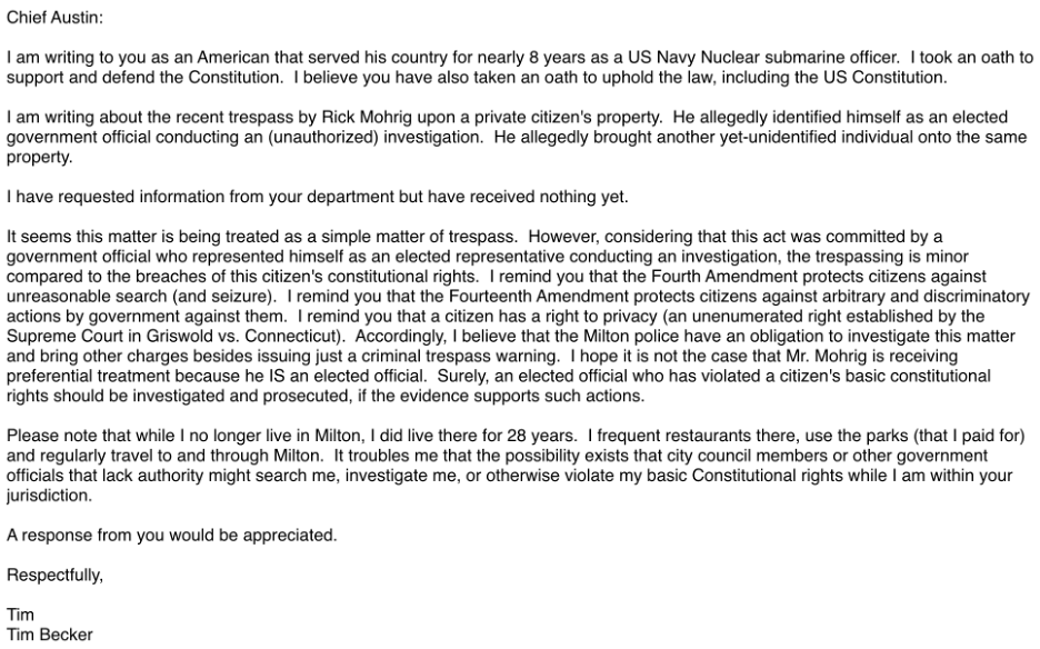And let’s be honest. District 3 is where Milton’s Democrats and black & brown voters are concentrated. If the intent was to appeal to voters based on party affiliation, then you certainly want to make it difficult for District 3 voters to vote. And as we know, Mohrig’s campaign was hyper-partisan (although important issues in Milton never break along party lines). Mohrig’s counterfeit conservative canvassers touted Mohrig as “the Republican candidate” and labeled Cranmer as “the Democrat candidate.” Mohrig was promoted at an extremist right-wing media site . . . where he even participated in a video interview. And let’s truthfully talk about racial/ethnic intolerance. Even if the election design intent was not discriminatory, the outcome—reducing the black and brown vote—was clearly discriminatory . . . and therefore the design was inherently discriminatory. This is common-sense logic, except with the counterfeit conservative fringe element