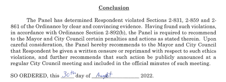 So what is the next chapter in this ethics scandal? The Superior Court ruling advised Mr. Palazzo that he has 30 days to sue for his legal costs and fees. Mr. Palazzo certainly deserves cost recovery. Paying Mr. Palazzo’s costs would seem condign and fair punishment of Mr. Moore given that City Council refused to impose any punishment on Mr. Moore in the wake of his conviction . . . which likely emboldened Mr. Moore to sue Mr. Palazzo.