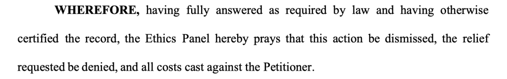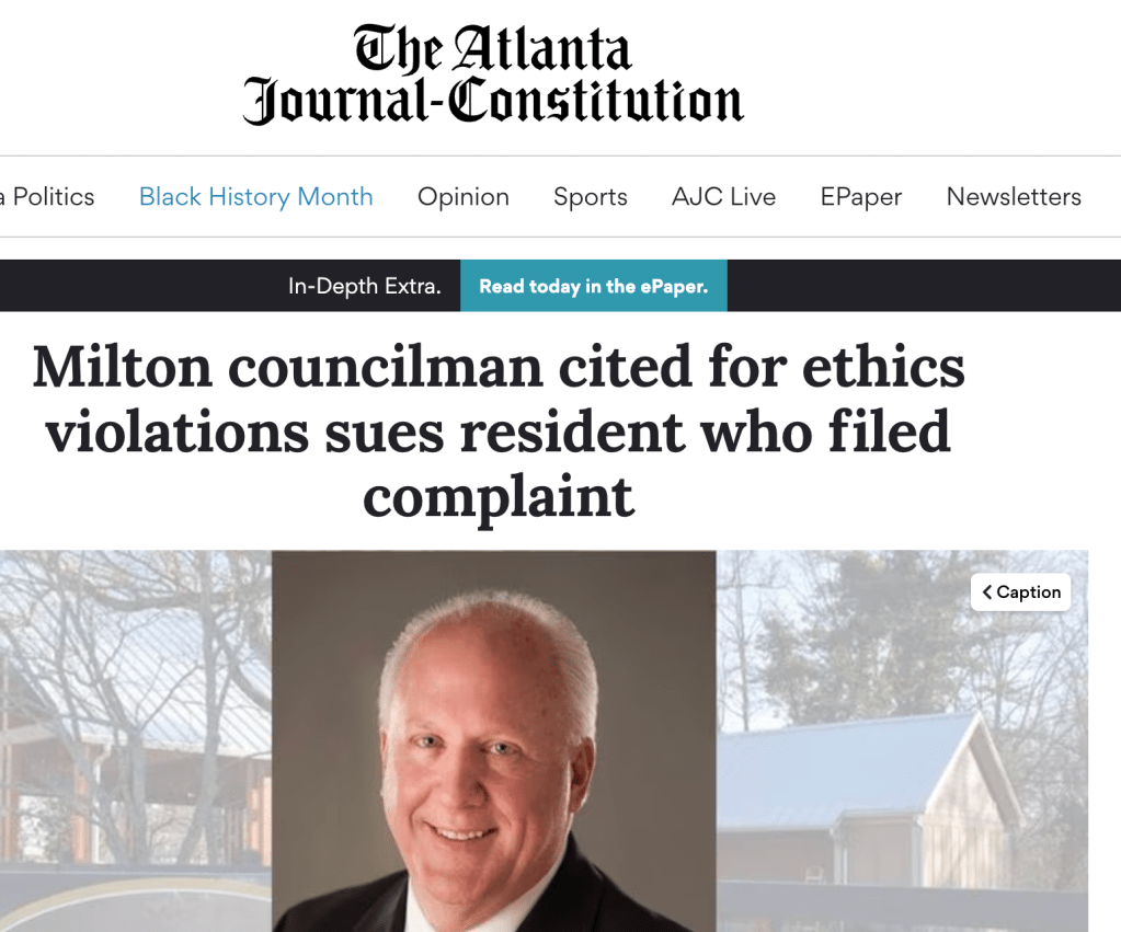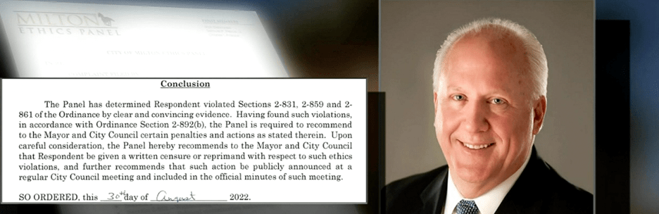By way of background, on August 30, 2022, Council Member Moore was found guilty of 3 ethics charges in a unanimous decision by a panel of 3 attorneys touted by the city as being experts in due process. On November 16, 2022, Mr. Moore appealed his conviction by suing Tony Palazzo, who filed the original ethics charges against Mr. Moore. Mr. Moore also named the City of Milton and the Milton ethics panel as defendants. At this time, the City filed a response that supported the ruling of its ethics panel (but the City has since claimed it is just “bystander” and will “abide” by the decision of Superior Court—whatever that means). Both Mr. Palazzo and Moore submitted written pleadings to the court. Mr. Moore dismissed the attorney that originally handled his case before the ethics panel, and Moore then hired a high-powered attorney that specializes in ethics cases . . . but to no avail.